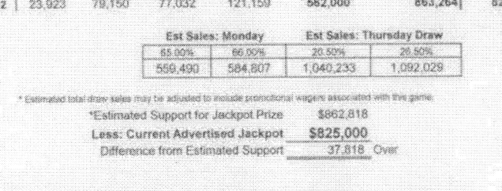 This morning I obtained official sales figures for Texas 2 Step. As it turns out, the amount allocated from sales to pay a jackpot winner was $10 more than I estimated last night - The Texas Lottery had $868,512 to pay a winner but advertised the jackpot at $825,000. The winner will only receive the $825,000. Folks this is wrong. Executive staff assured the Commissioners many years ago that they would be fair in their "advertising" figures when the jackpots are "guaranteed." This is NOT fair in my opinion. You all need to speak up - contact your state legislator and tell them that you would appreciate it if the Texas Lottery would quit low balling advertised jackpot amounts. They were overly conservative in the the advertised amount and they knew exactly what they were doing as is shown on their jackpot estimation sheet. In the end, they were "over" by $43,502. The jackpot should have been advertised at $850 and this would have been fairer.