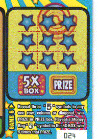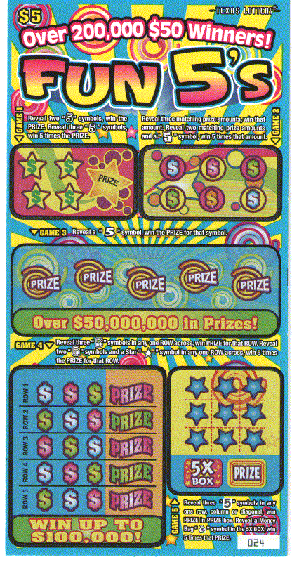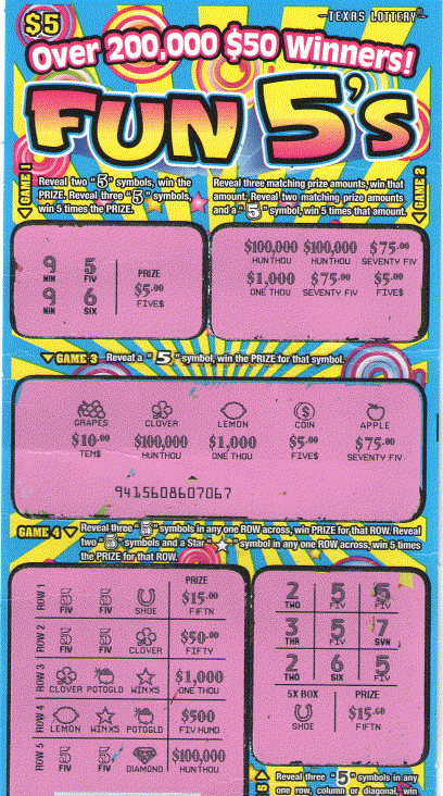 TEX PE. CODE ANN. § 32.42 : (a) For purposes of this section: --------------------------------------------- Official Game Rule - Posted in the Texas Register on June 20, 2014 2.0 Determination of Prize Winners. The determination of prize winners is subject to the general Ticket validation requirements set forth in Texas Lottery Rule §401.302, Instant Game Rules, these Game Procedures, and the requirements set out on the back of each Instant Ticket. A prize winner in the "FUN 5'S" Instant Game is determined once the latex on the Ticket is scratched off to expose 52 (fifty-two) Play Symbols. GAME 1: If a player reveals two "5" Play Symbols, the player wins the PRIZE. If a player reveals three "5" Play Symbols, the player wins 5 times the PRIZE. GAME 2: If a player reveals three matching prize amounts Play Symbols, the player wins that amount. If a player reveals two matching prize amounts Play Symbols and a "5" Play Symbol, the player wins 5 times that amount. GAME 3: If a player reveals a "5" Play Symbol, the player wins the PRIZE for that symbol. GAME 4: If a player reveals three "5" Play Symbols in any one ROW across, the player wins the PRIZE for that ROW. If a player reveals two "5" Play Symbols and a "STAR" Play Symbol in any one ROW across, the player wins 5 times the PRIZE for that ROW. GAME 5: If a player reveals three "5" Play Symbols in any one row, column or diagonal, the player wins the PRIZE in the PRIZE box. If a player reveals a "MONEY BAG Play Symbol in the 5X BOX, the player wins 5 times that PRIZE. No portion of the Display Printing nor any extraneous matter whatsoever shall be usable or playable as a part of the Instant Game. 2.2 Programmed Game Parameters. This ticket has 3 fives in a row but it does NOT have a Money Bag in the 5x BOX.