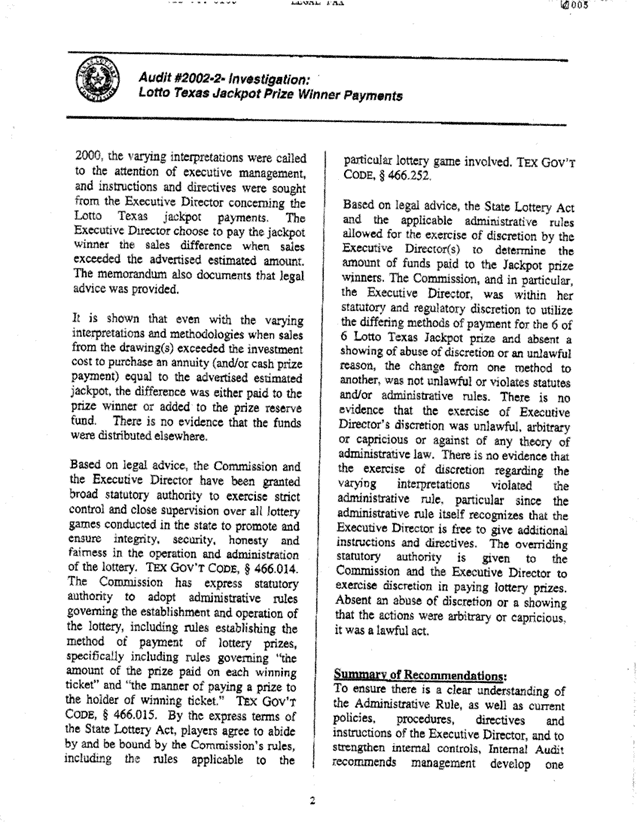 - 3 - Internal Audit Investigation #2002-2. The TLC faxed this document to me. The first paragraph, "Investigation Objective," please notice that it states my It took the TLC one year to confirm my "allegations." This was simply a stall. If you want the entire 10 pages, I'll be happy to fax them to you or